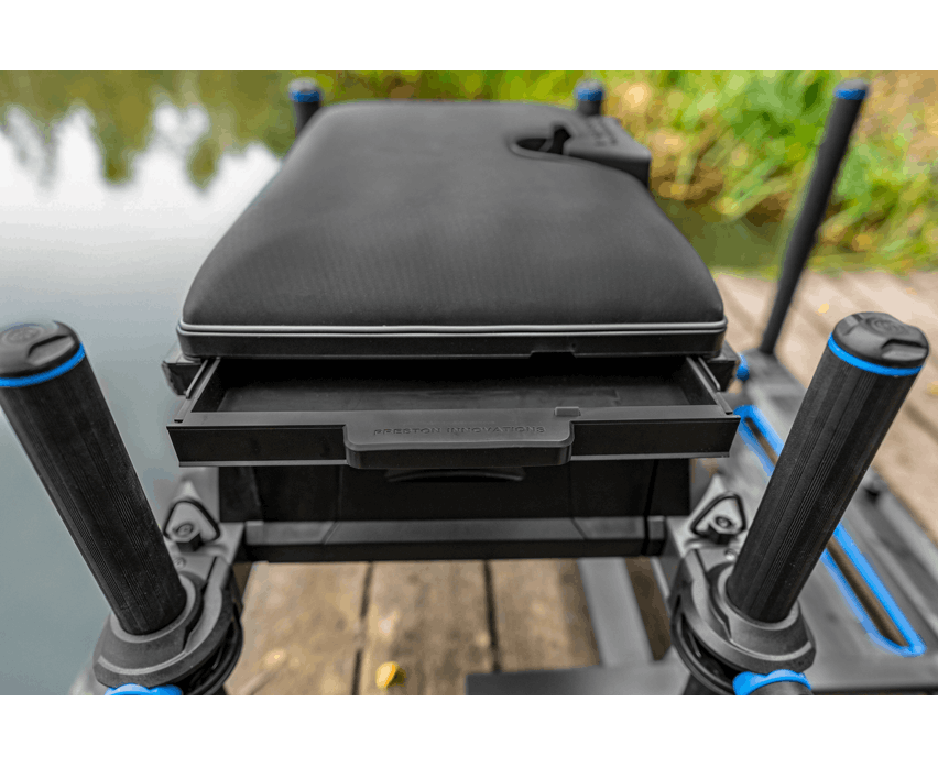 Die H-Rahmen-Struktur umfasst auch eine tiefe zentrale Aufbewahrungsschublade, die den Hauptteil der Preston Absolute 5G Seatbox. Dies bietet großzügigen, leicht zugänglichen Raum für wichtige Angelausrüstung, wodurch es einfach ist, wichtige Gegenstände zu organisieren und schnell zu erreichen.